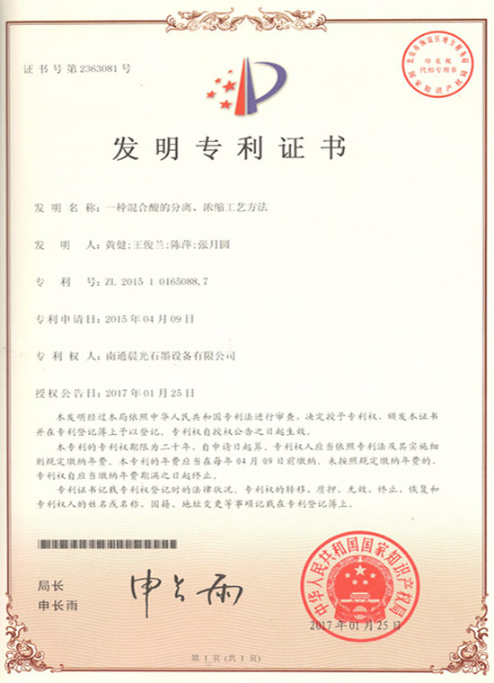 發(fā)明專利:一種混合酸的分離、濃縮工藝方法 專利號:ZL 2015 1 0165088.7