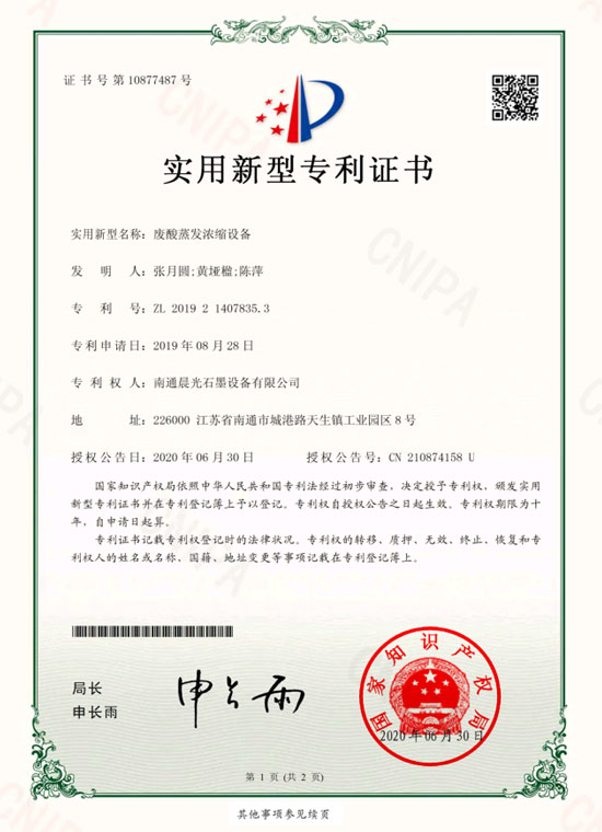 實用新型專利 :廢酸蒸發(fā)濃縮設(shè)備 專利號:ZL 2019 2 1407835.3
