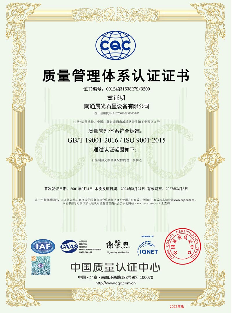 實用新型專利 :石墨換熱器 專利號:ZL 2019 2 1407837.2